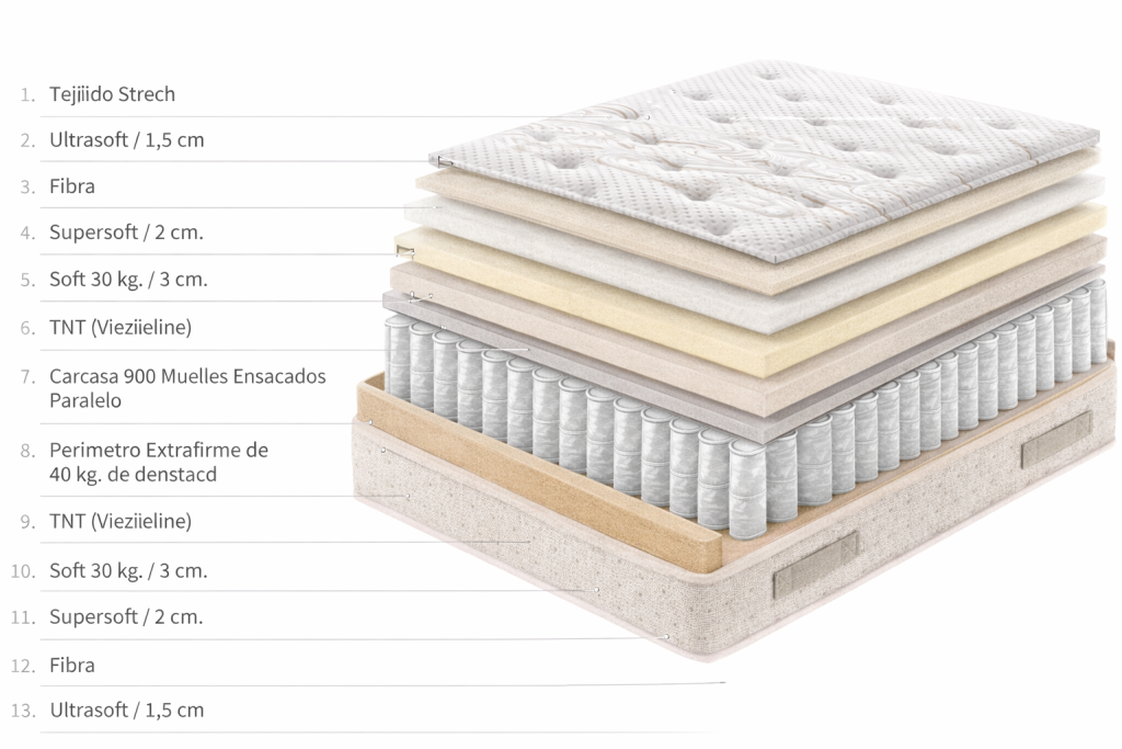 - Capas de confort superiores: Sobre el núcleo de muelles se añaden capas de materiales como viscoelástica, látex natural, Núcleo HR o fibras naturales. Estas capas proporcionan la adaptabilidad, el acolchado y el confort necesarios para un descanso óptimo.